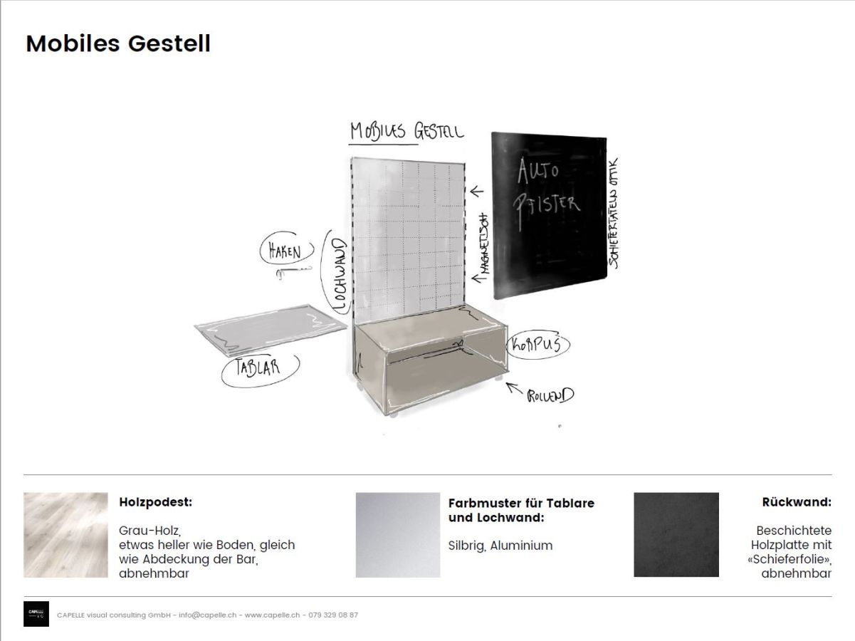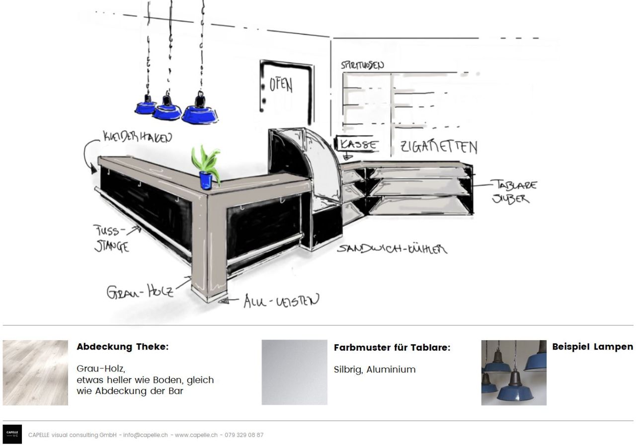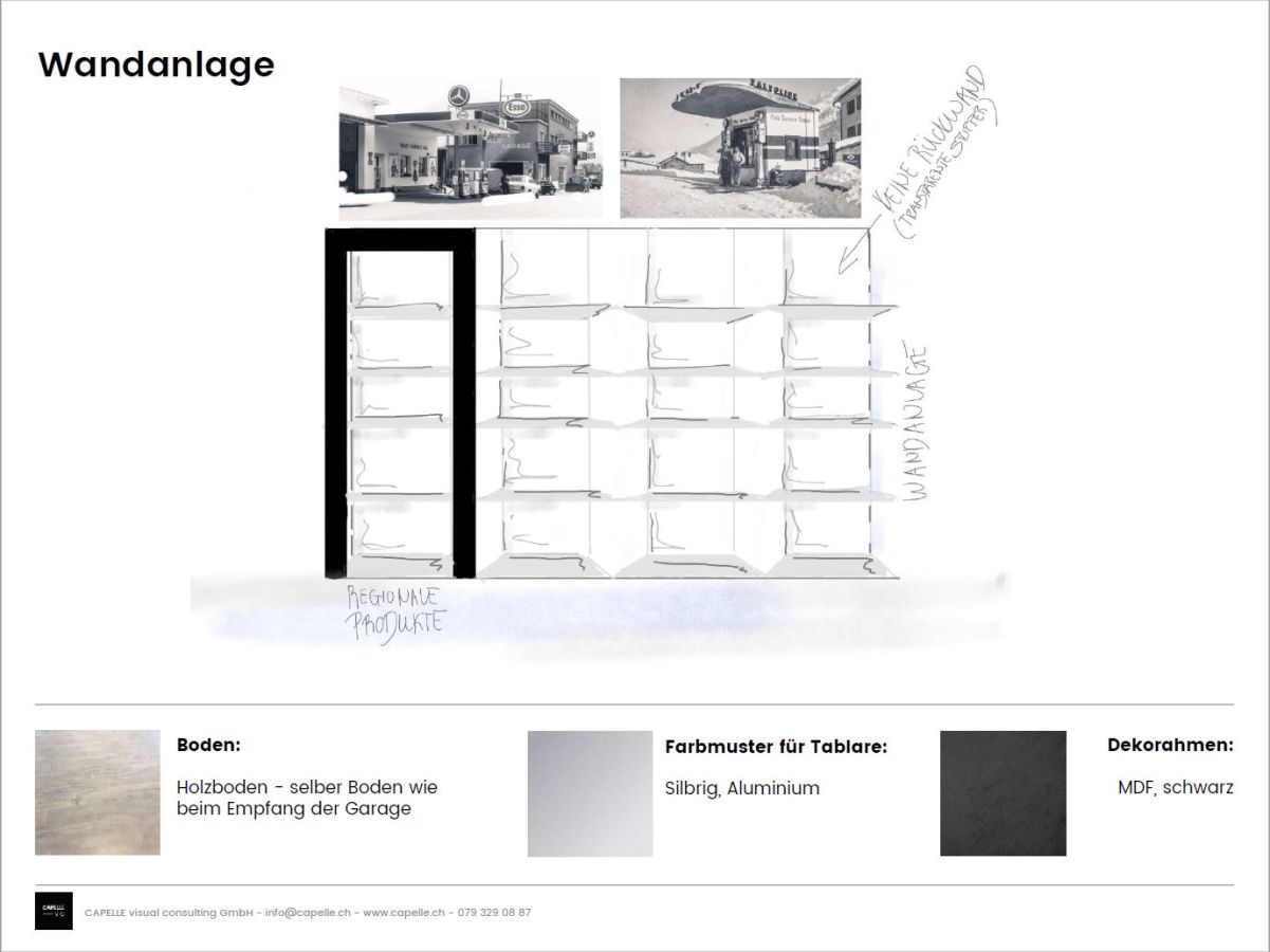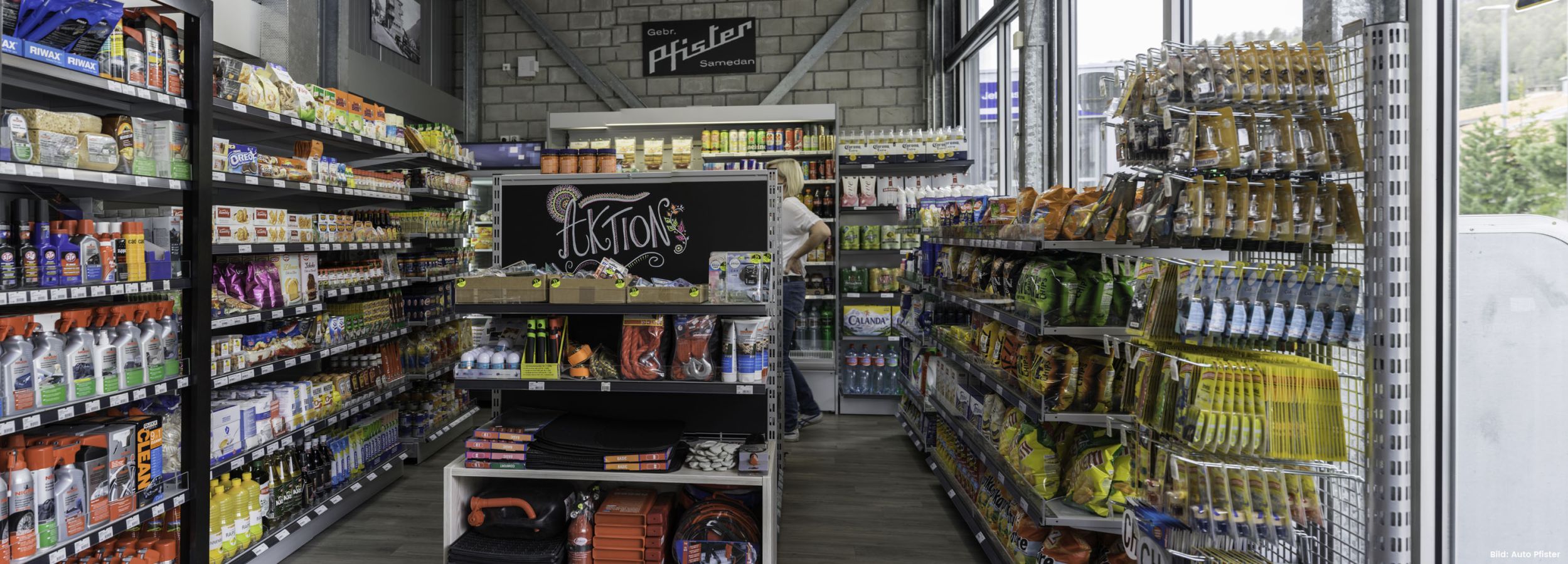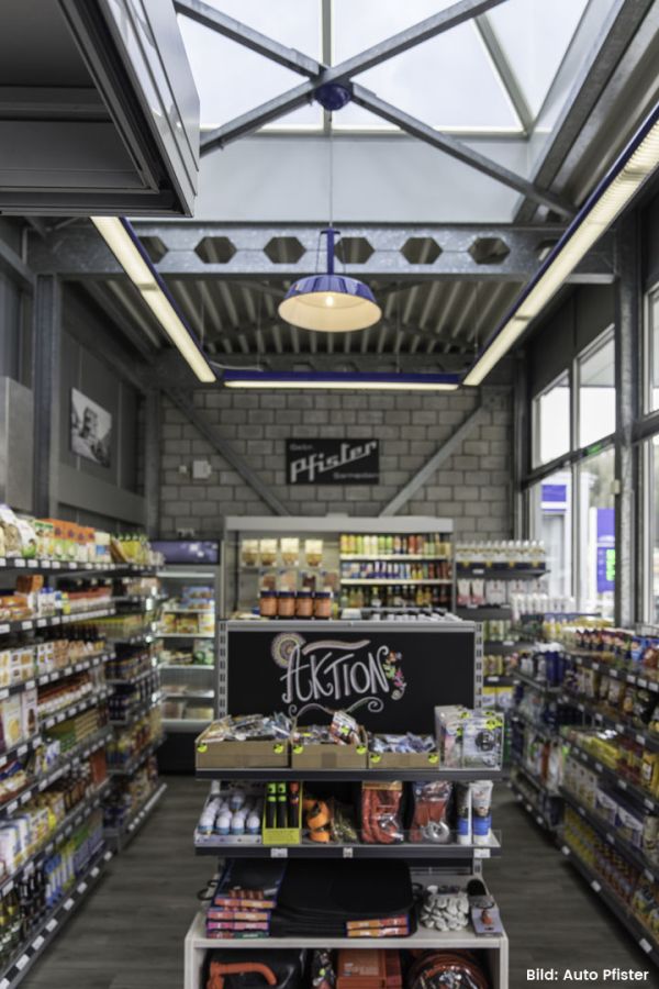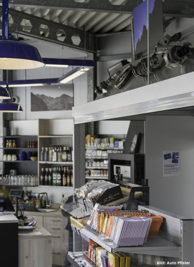 Es war uns sehr wichtig, der Kundschaft eine stimmungsvolle Atmosphäre zu bieten. Man soll sich wohlfühlen und das Wichtigste einkaufen können. In den Räumlichkeiten soll es möglich sein, einzukaufen, sich zu verpflegen, sich in Pausen und am Feierabend treffen zu können. Hervorgehoben wurde die Geschichte von Auto Pfister, die Nähe zur Garage und die Verbundenheit mit der Gegend.